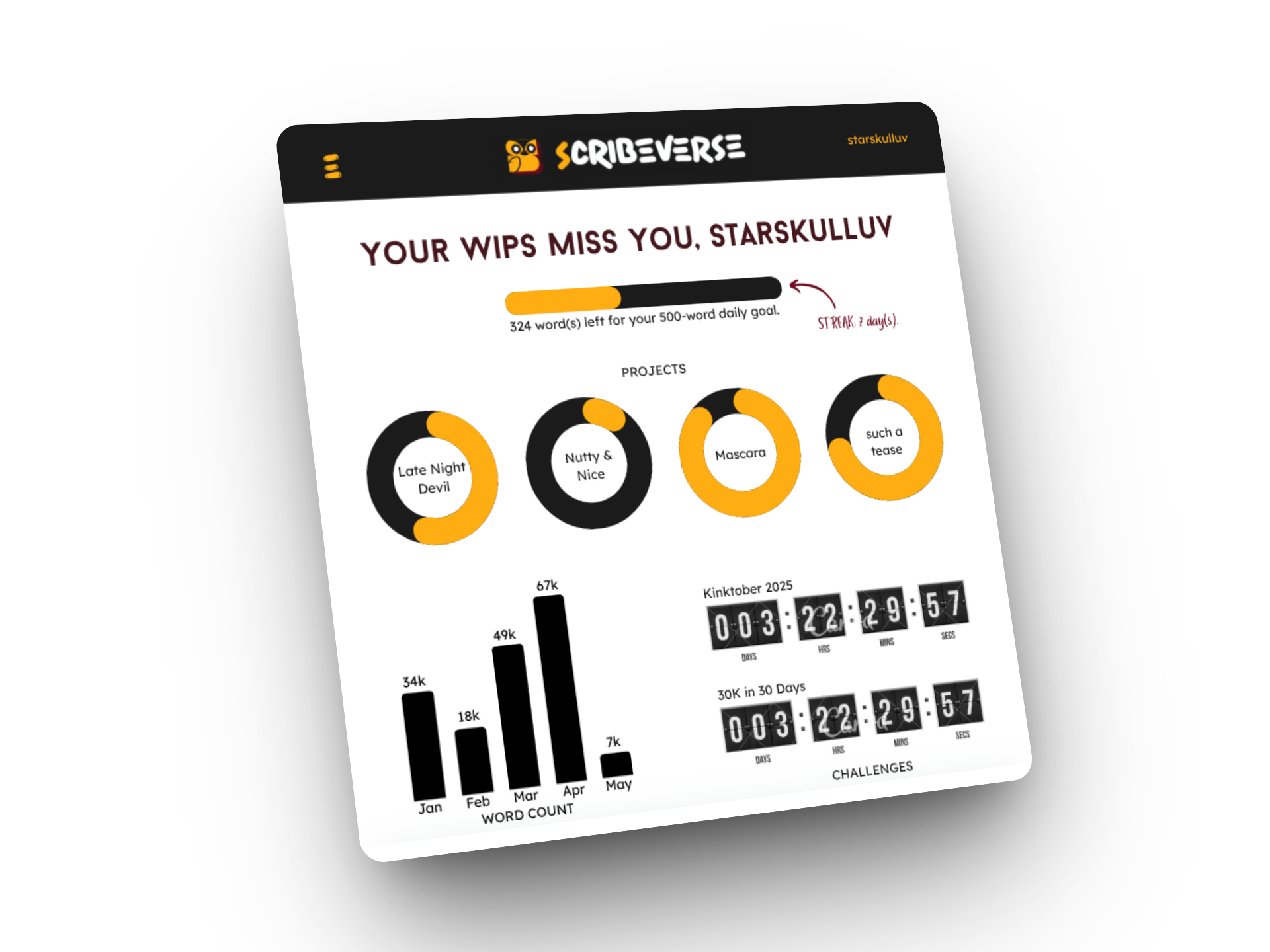 Track daily word goals, streaks, active projects, challenges, and more without digging through endless folders and tabs.