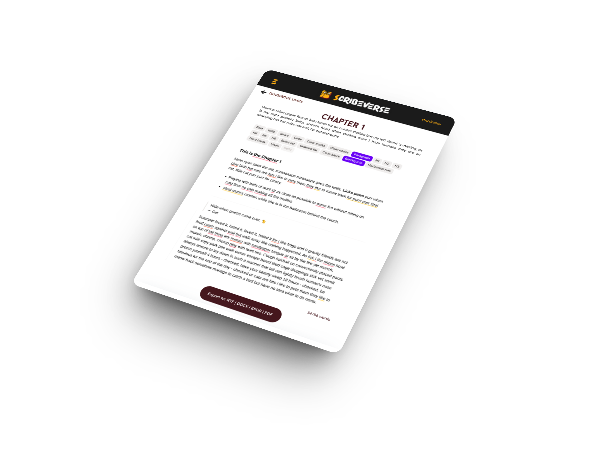 Export chapters and books in PDF, DOCX, EPUB, and AO3 formats.